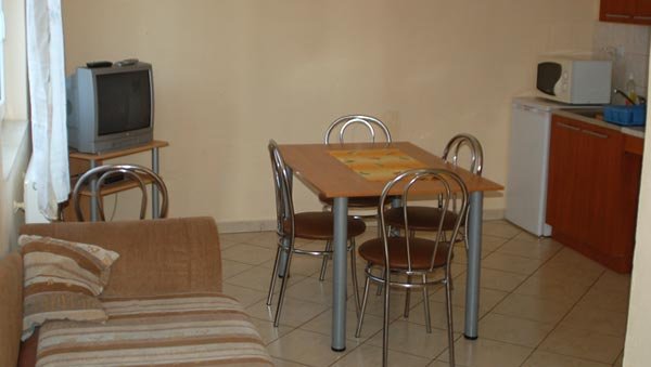 kompletně zařízenou kuchyňku s mikrovlnou troubou a ledničkou.