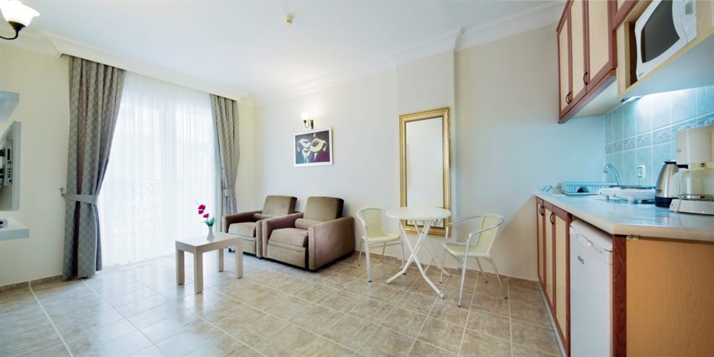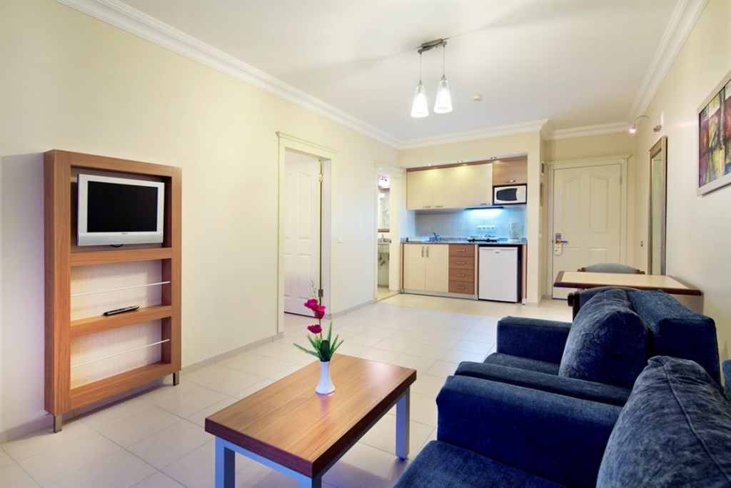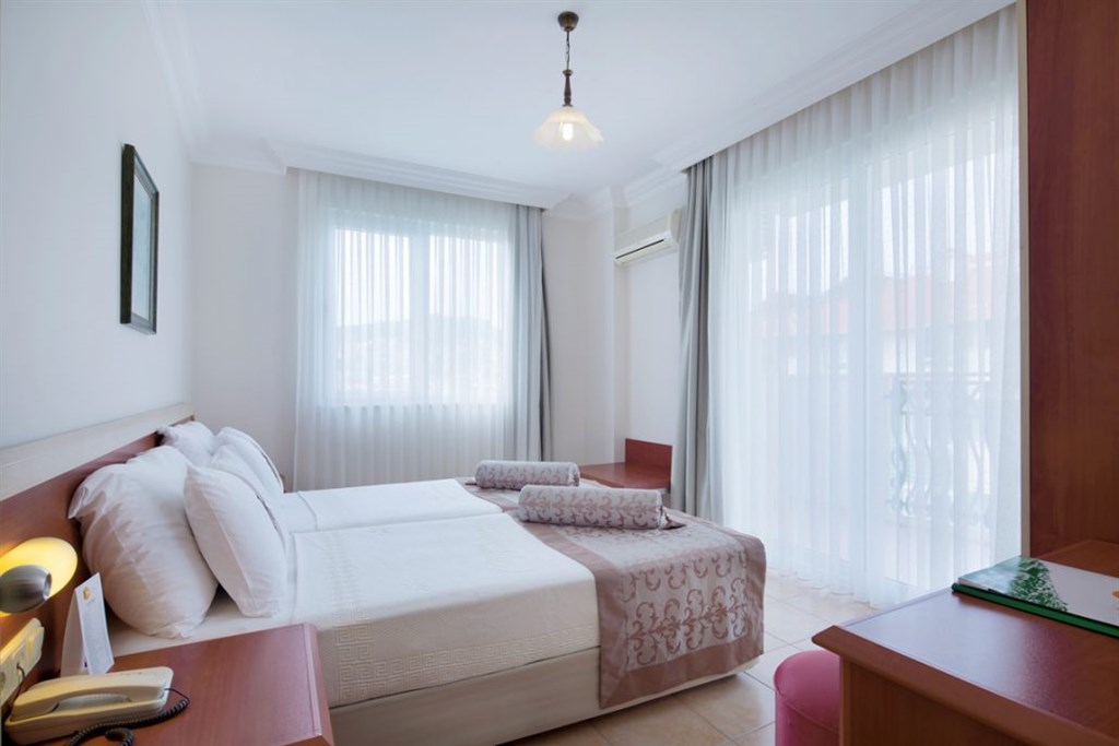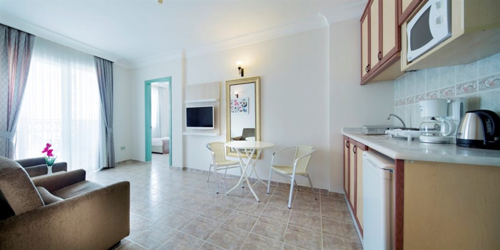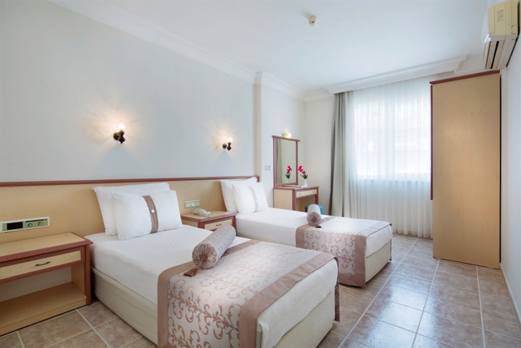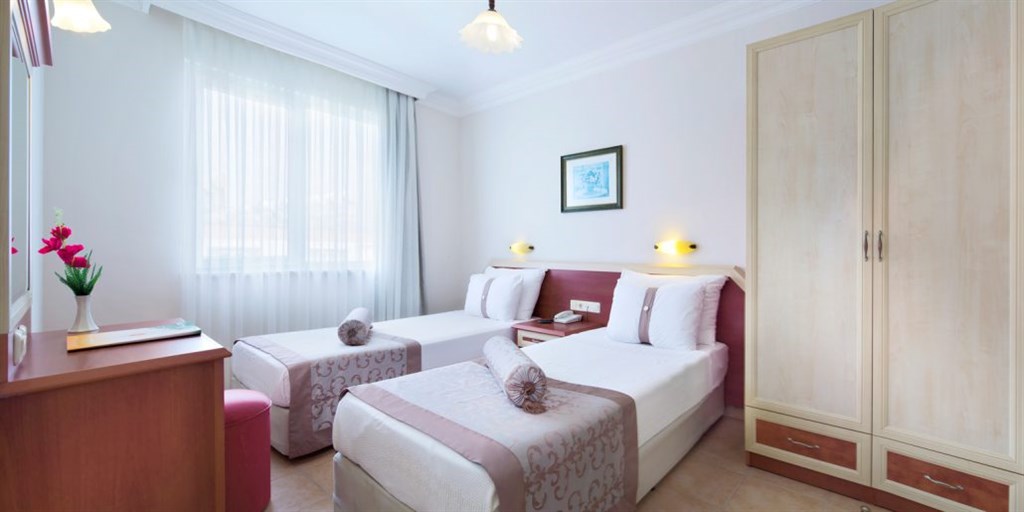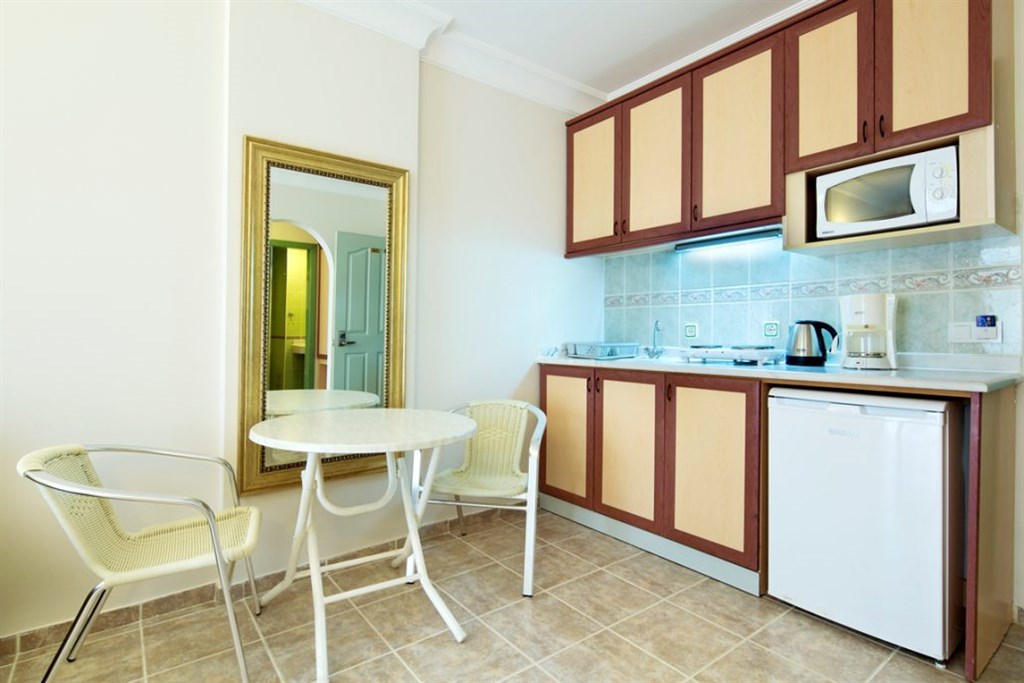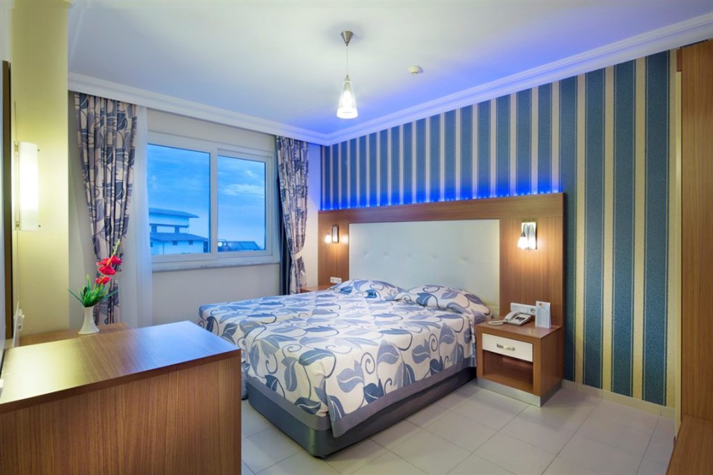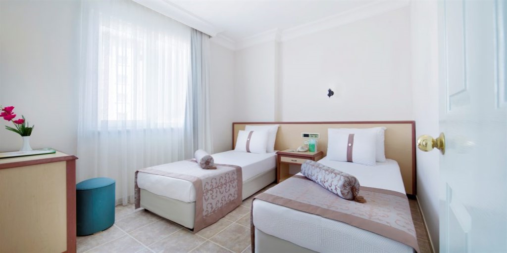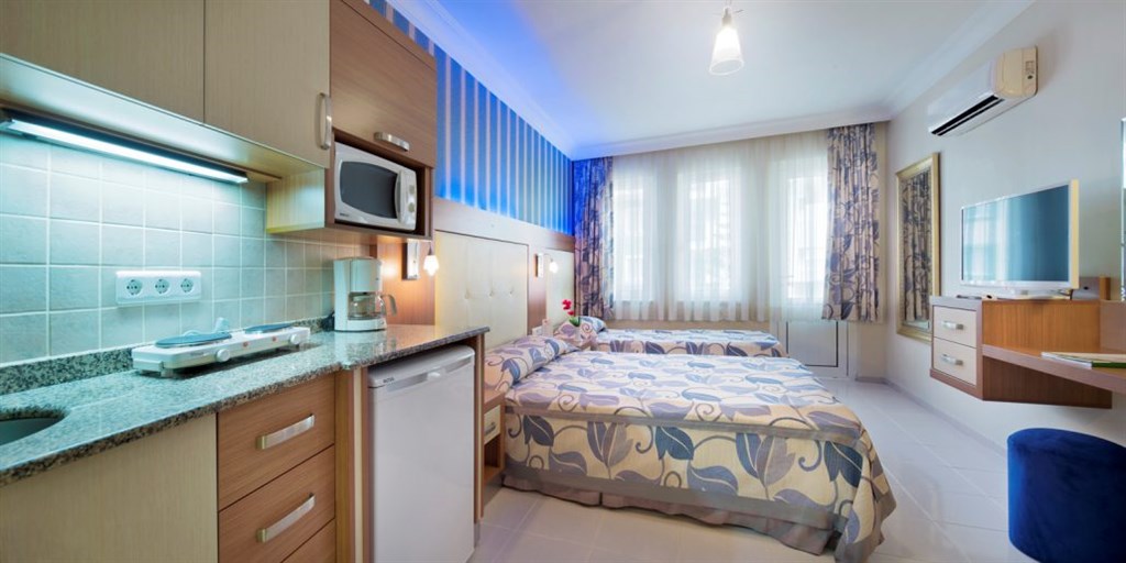 Pokoje jsou vybaveny koupelnou se sociálním zařízením, TV ( s převahou tureckých kanálů), klimatizací (za poplatek), chladničkou, kuchyňskou linkou (se základním vybavením), příslušenstvím pro přípravu kávy, trezorem (za poplatek), Wi- Fi připojením, vysoušečem vlasů, telefonem, balkonem nebo terasou.