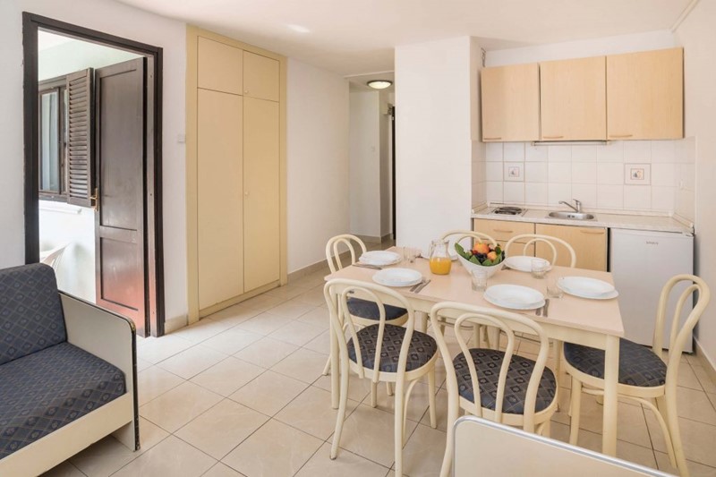 Polopenze (na vyžádání) formou švédských stolů, stravu musí čerpat všechny osoby v apartmánu, v ceně večeře jsou obsaženy neomezeně nápoje z automatu (1.6.-7.9.) - nealko nápoje, lokální pivo a víno.