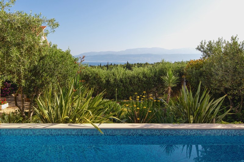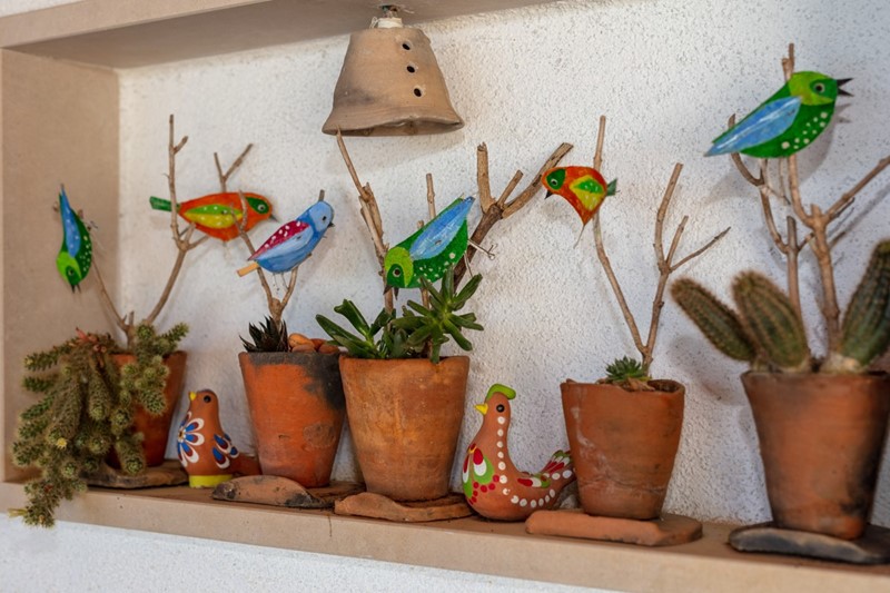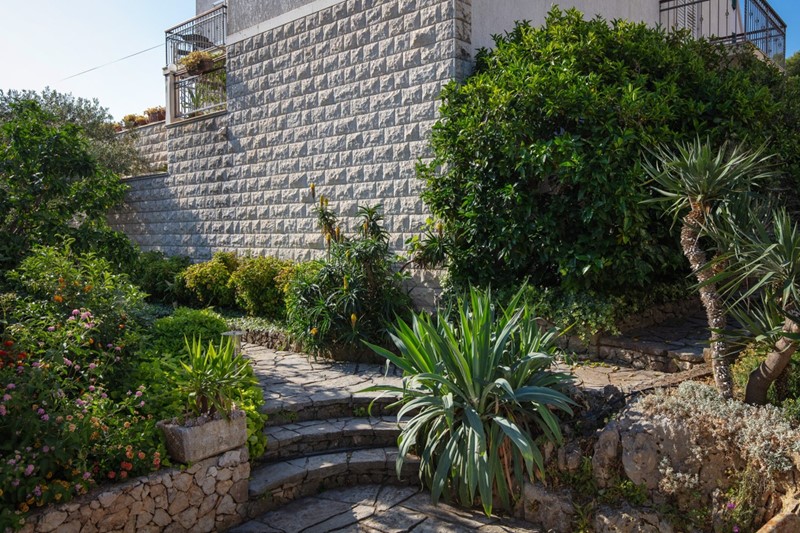 Vila se nachází v centru, i když byste to na první pohled neřekli: velká zahrada, pečlivě a důkladně vybavená malými i velkými rostlinami, kaktusy, agáve a květinami různých barev. Vile dominuje terasa s bazénem. V jejíž kryté části se nachází kuchyně s kamenným krbem, dřevěným stolem a židlemi. Obzvláště vás zaujme jeden ze sloupů střešního panelu: aranžované rostliny v květináčích visících kolem.