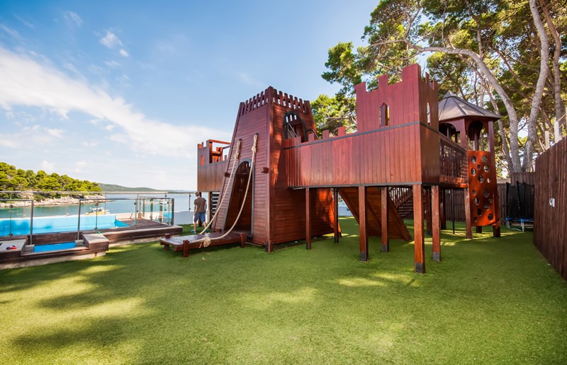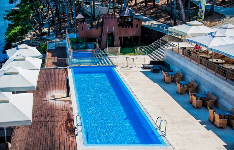 Vybavení: směnárna, pizzerie, WI-FI k dispozici dle popisu, bazén venkovní sladká voda , aperitiv bar, bazén dětský venkovní sladká voda , terasa, dětské hřiště, výtah, konoba, restaurace, recepce.